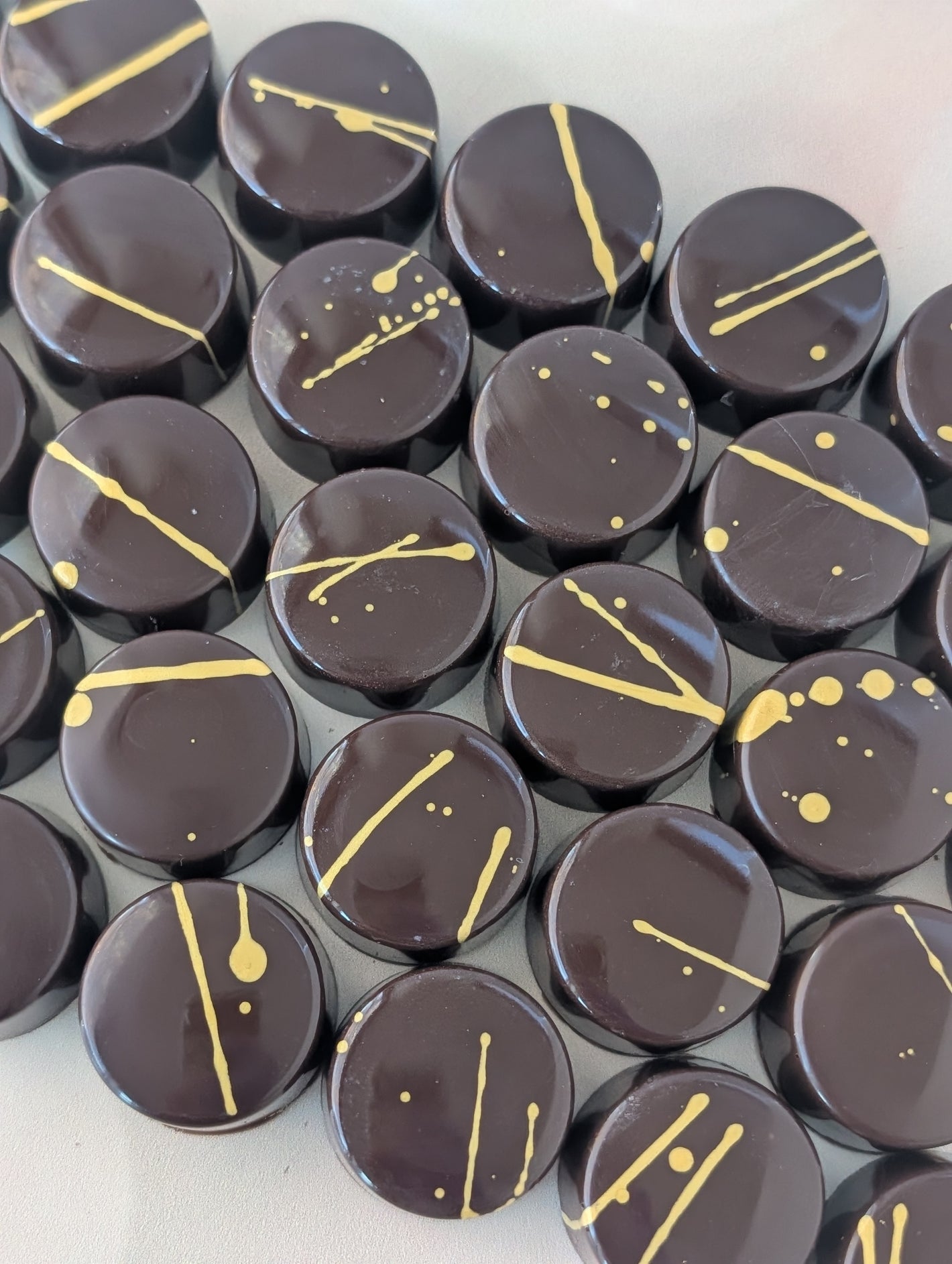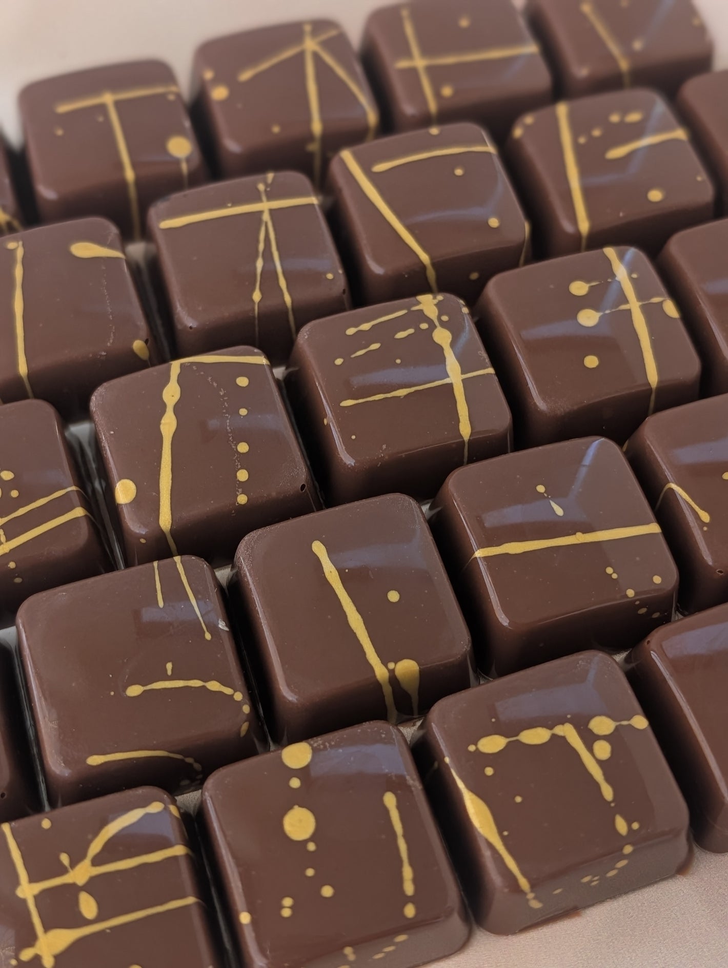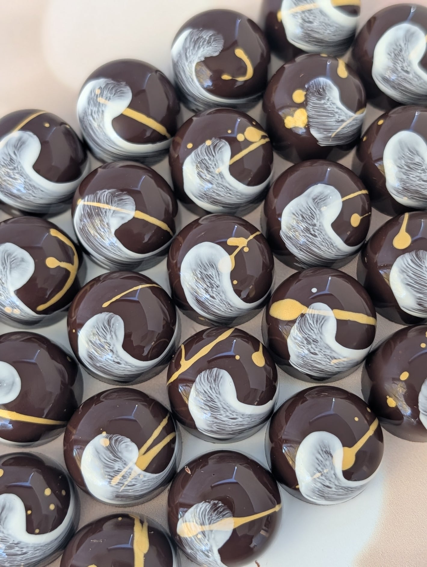 - When you are ready to consume or give them away, bring the chocolate bonbon box to room temperature by placing the entire box & bag in a cooler before opening to maximize the shine.